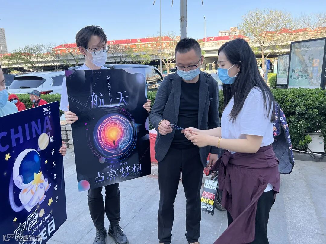 中航天集团本部团支部积极参与航天日海报设计,并将青年创作的海报制作成书签,在资和信广场分发书签并宣传航天日及航天历史。