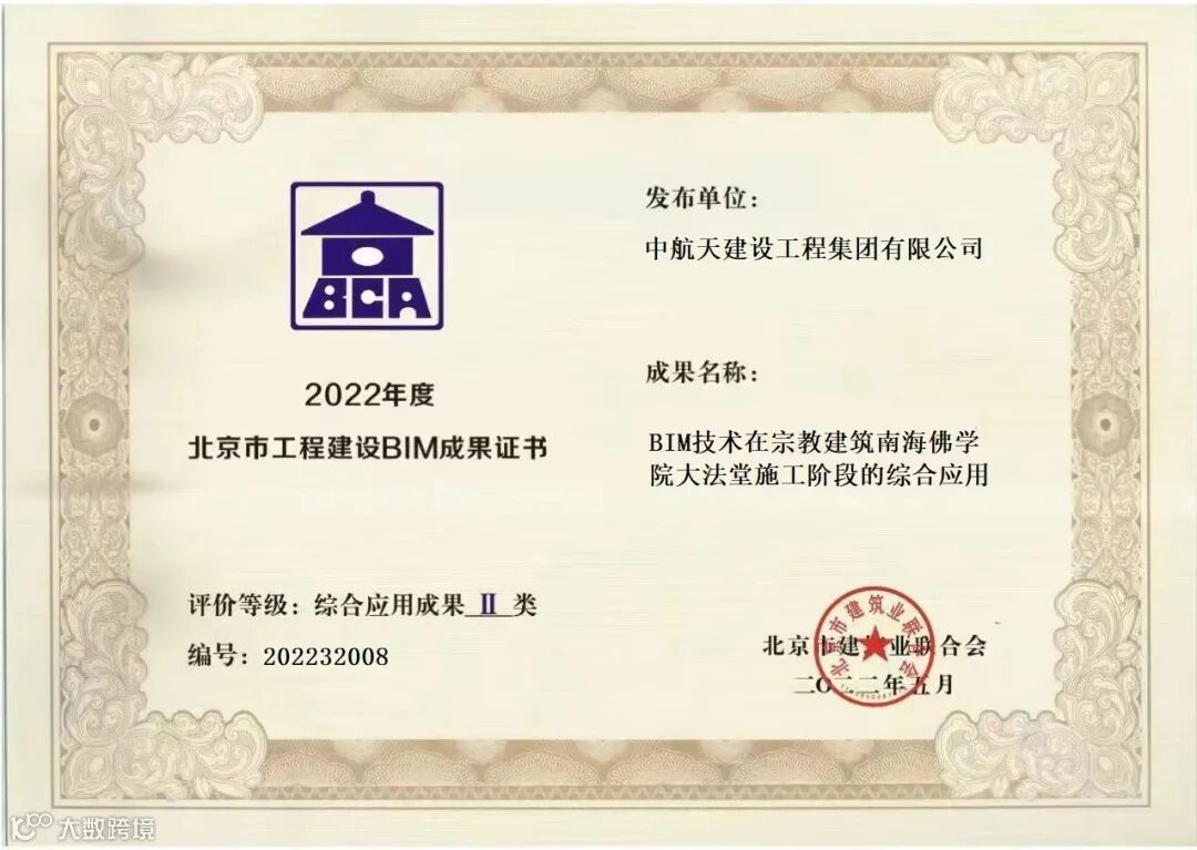 中航天集团九公司《BIM 技术在宗教建筑南海佛学院大法堂施工阶段的综合应用》获得2022年度北京市工程建设BIM大赛综合应用类II类成果。