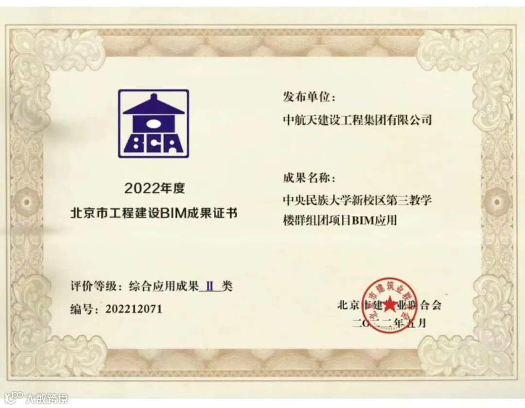 中航天集团六公司《中央民族大学新校区第三教学楼群组团项目BIM应用》成果荣获2022年度北京市工程建设BIM大赛综合应用类II类成果。