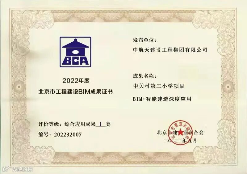 中航天集团一公司《中关村三小项目BIM+智能建造深度应用》成功斩获2022年度北京市工程建设BIM大赛综合应用类I类成果,该成果是中航天集团取得的首个I类省部级BIM大赛成果。