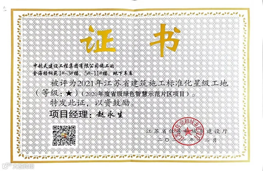 2月17日,江苏省连云港市住建局组织召开全市建筑市政工程安全生产百日攻坚暨节后复工复产会议并颁发荣誉证书,中航天建设工程集团有限公司八公司金海梧桐苑项目荣获2021年江苏省建筑施工标准化星级工地。