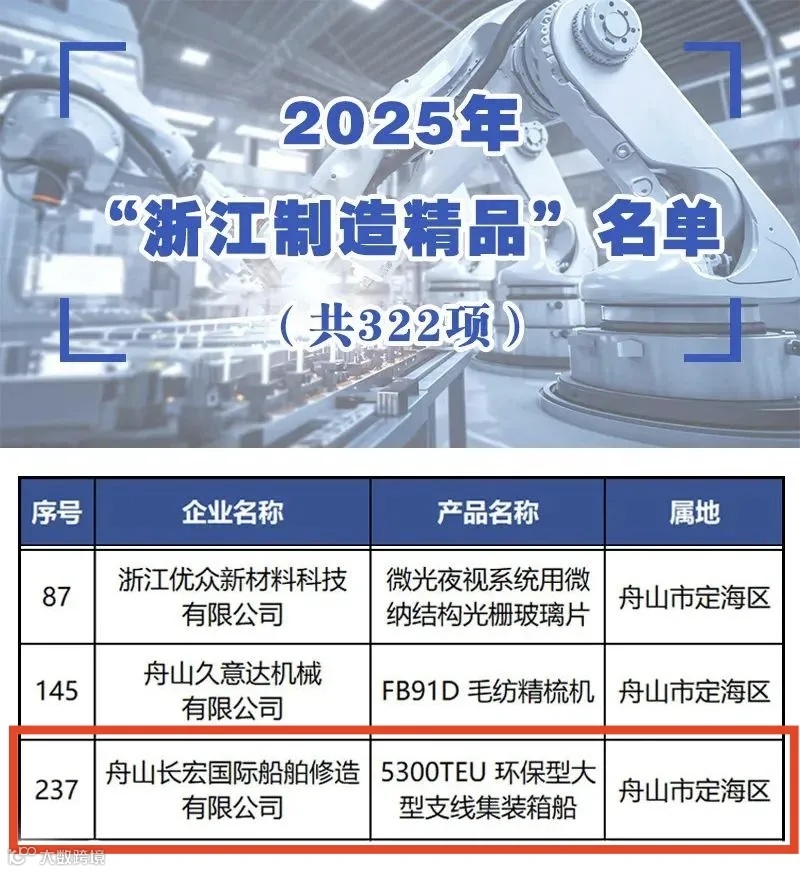 近日,浙江省经信厅正式公布了2025年度“浙江制造精品”名单,长宏国际“5300箱环保型大型支线集装箱船”脱颖而出,成功入选。