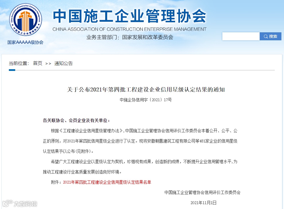 11月3日,中国施工企业管理协会公布了2021年第四批工程建设企业信用星级认定结果,中航天建设工程集团有限公司榜上有名,被授予5星级企业。