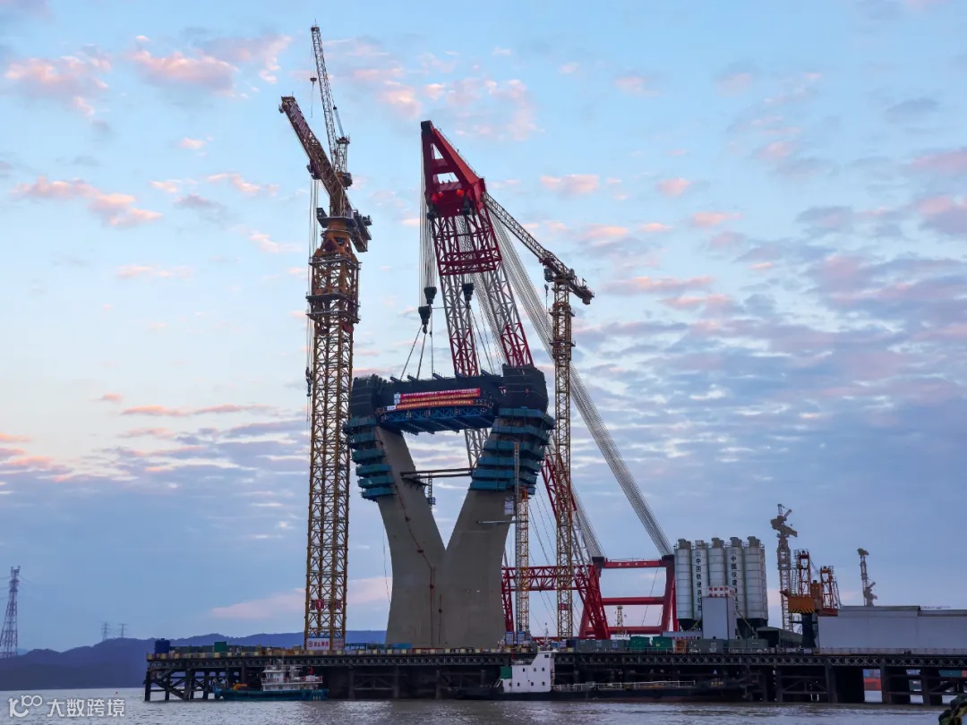 如今,六横桥项目青龙门大桥已连续发运18船次,34个索塔部品节段也陆续安装到位。得益于创新的模块化生产方式,现场施工点大幅减少,项目海上承台的施工现场并不见满铺施工平台,仅沿着节段环口铺设开来,宛如给索塔镶上层层蓝色裙边。