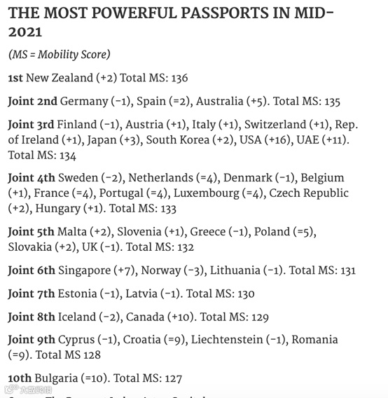 近日,全球财务顾问公司阿尔顿资本(Arton Capital)也公布了最新的护照排行榜。该排行榜以护照流动性分数为排名依据,而这一分数主要由免签国数量和落地签国家数量决定,并将疫情导致的旅行禁令考虑在内。