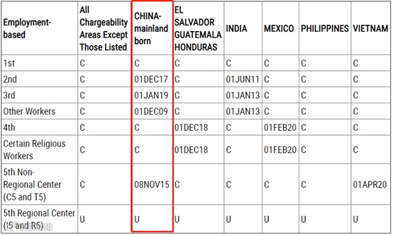 在EB-1签证类别上,表A中国大陆出生投资人一栏显示为“C”,即代表出生地为中国大陆的EB-1类移民申请人,在申请获美国移民局(USCIS)批准之后,就直接进入到了领馆的移民面试阶段,没有所谓的签证排期。