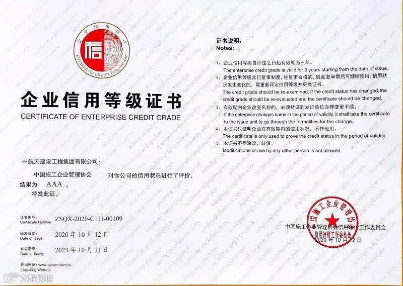 10月13日,中国施工企业管理协会印发了《关于公布2020年度第一批工程建设企业信用评价结果的通知》(中施企协字〔2020〕55号),中航天集团被授予AAA信用企业。