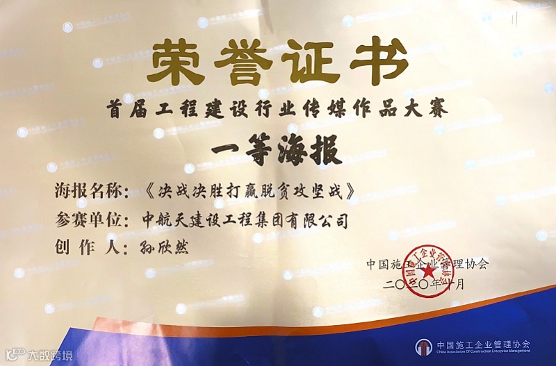 近日,中航天集团海报作品《决战决胜打赢脱贫攻坚战》荣获中国施工企业管理协会首届工程建设行业传媒作品大赛一等奖。