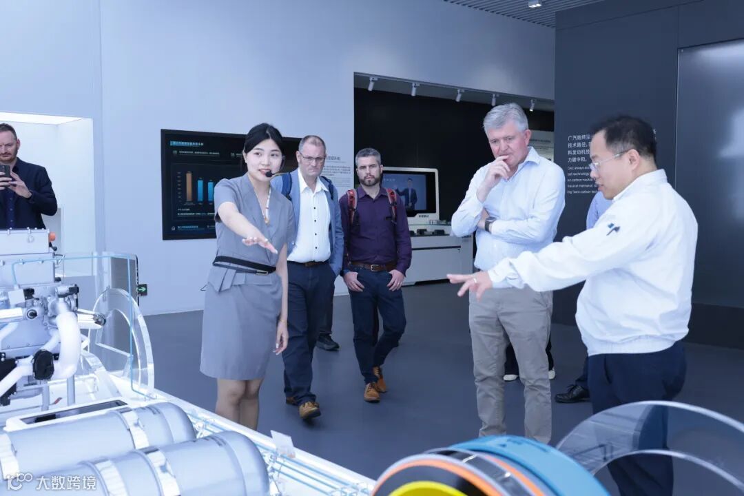 在广汽集团代表的陪同下,英国大昌研究中心CEO乔纳森・休伊特一行首先参观了广汽集团 T2 大堂与科技展厅,通过展厅内的技术陈列、产品模型及互动演示,系统了解广汽在新能源汽车、智能驾驶领域的核心研发成果,直观感受广汽的创新能力与技术积淀。