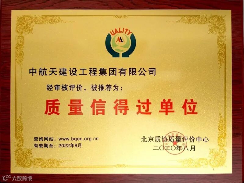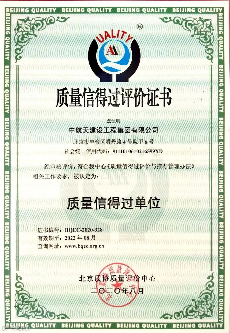 近日,经北京质协质量评价中心审核,中航天建设工程集团有限公司符合《质量信得过评价与推荐管理办法》相关要求,被推荐为“质量信得过单位”。