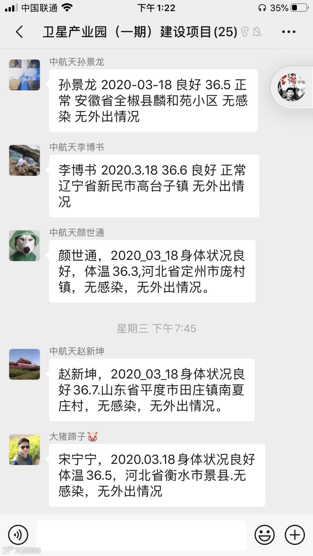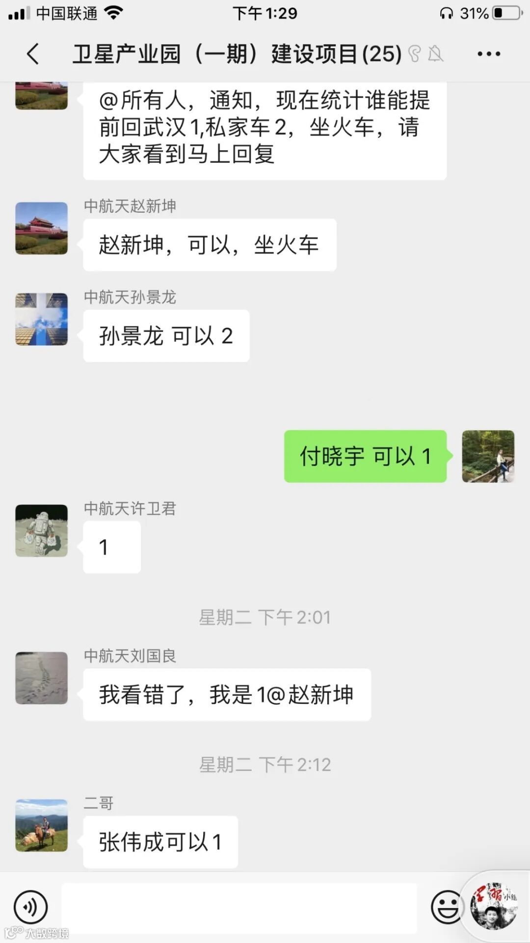 自疫情以来,中航天集团二公司武汉卫星产业园项目人员每天在群里进行健康打卡,不仅做好个人隔离也在为复工做好前期准备。在这个特殊时期,为了能实现“点对点”的返岗,武汉卫星产业园项目的员工只能自驾回汉。项目经理刘国良不计报酬将自己的车贡献项目公用,为项目出行提供保障,尽管他十分牵挂家里刚满月的女儿“花朵”,但依然作为第一批人员返鄂复工。他说:“我不但是项目第一负责人,我更是一名党员,希望大家都能跟上我的脚步。”刘永升、张伟成、孙远禄在和家人协商后,也义无反顾地投身到提前返鄂复工的队伍中。