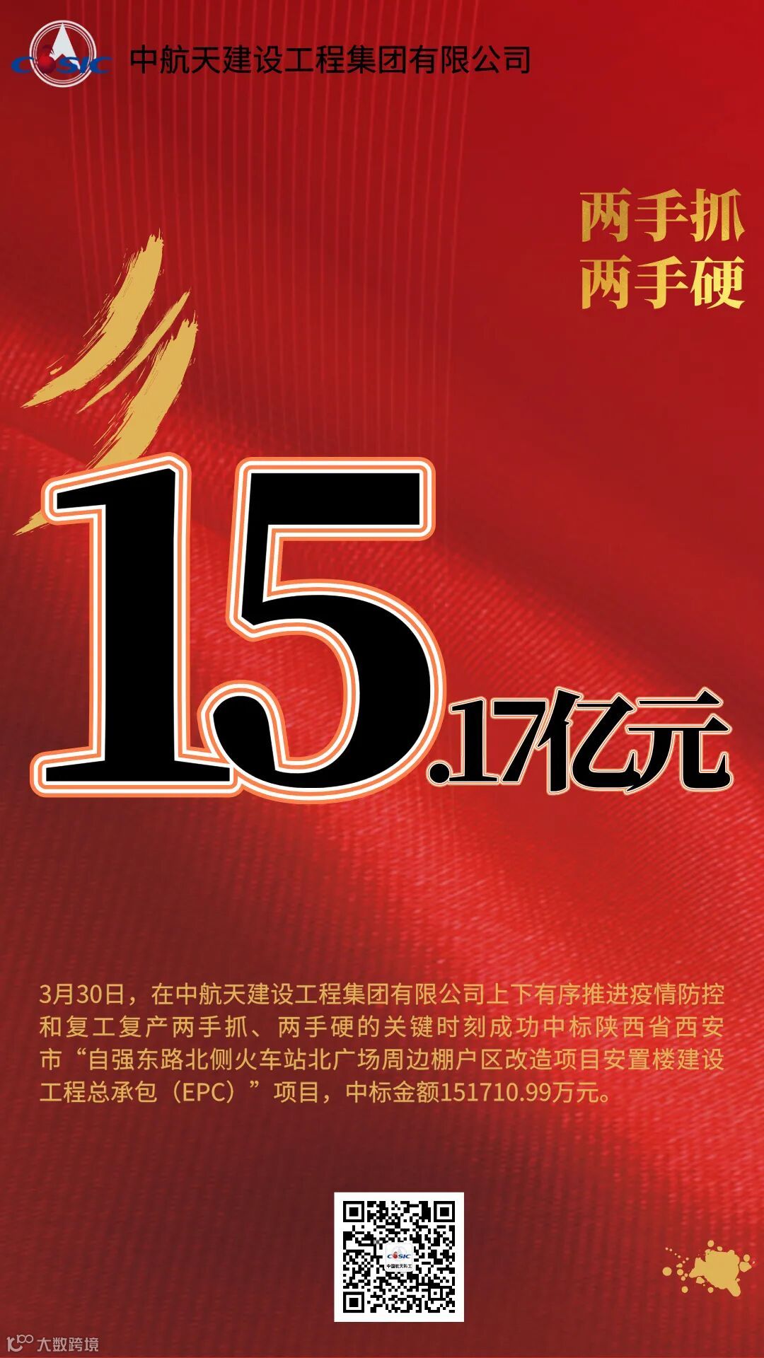 3月30日,在中航天建设工程集团有限公司上下有序推进疫情防控和复工复产两手抓、两手硬的关键时刻,中航天建设工程集团有限公司八公司成功中标陕西省西安市“自强东路北侧火车站北广场周边棚户区改造项目安置楼建设工程总承包(EPC)”项目,中标金额151710.99万元。