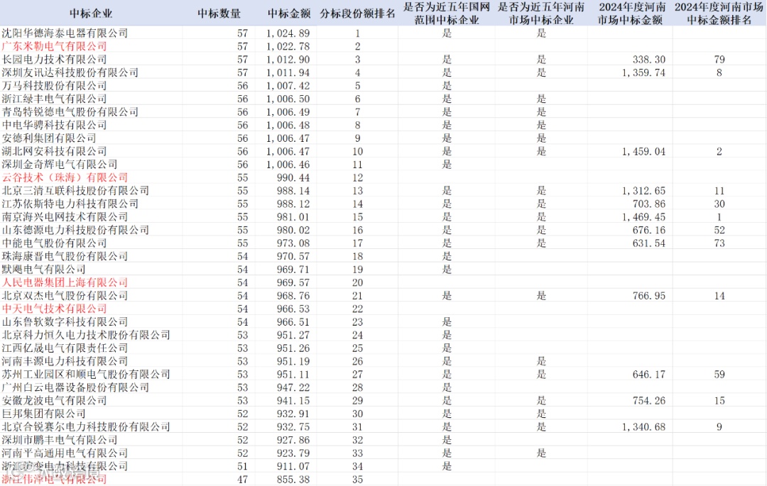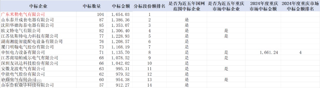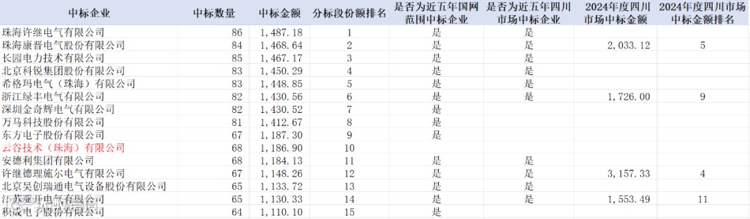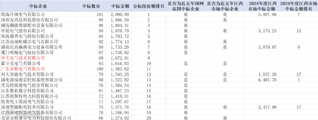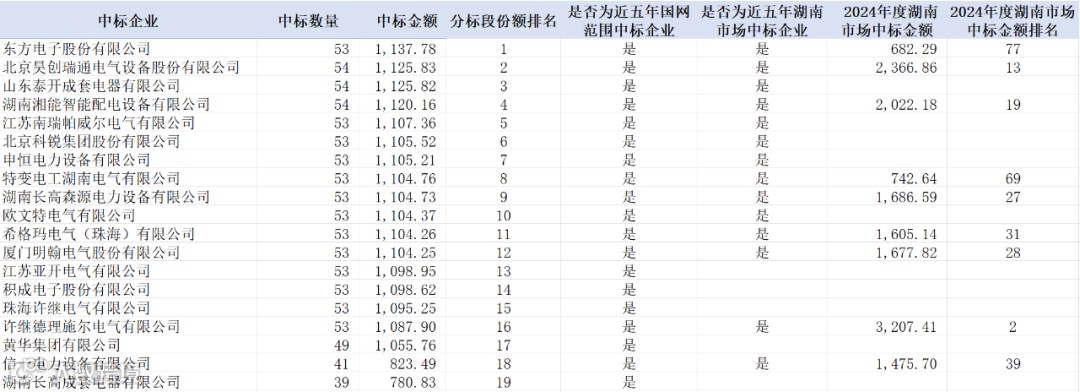 分析市场能力变化,2024年度中标企业中5家企业本次项目中标金额排名高于或与2024年度接近;2家近五年未在国网范围中过标的企业实现中标。详情如下:
