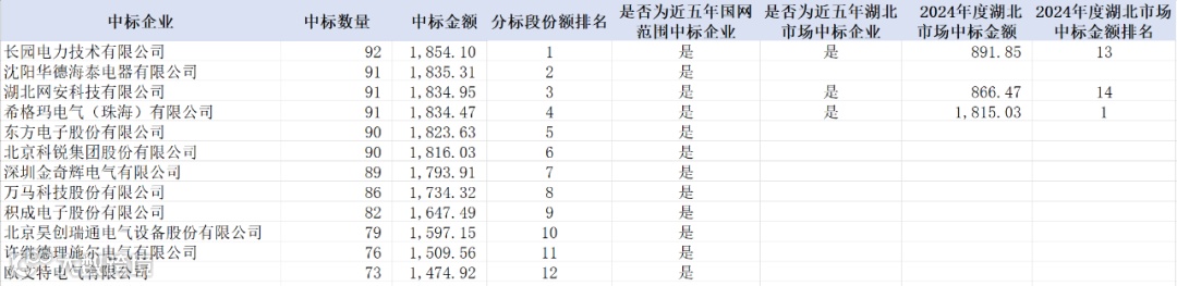 本项目12家中标企业,全部为近五年国网范围相同物资中标企业,同时3家为近五年湖北市场相同物资中标企业,其中9家企业不是2024年度湖北市场相同物资中标企业。