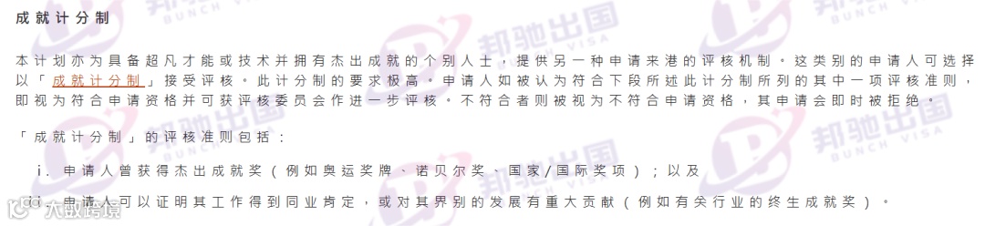 香港优才计划还有另外一种评核机制,那就是成就计分制,申请人满足以下其中一条评核准则即可申请:
