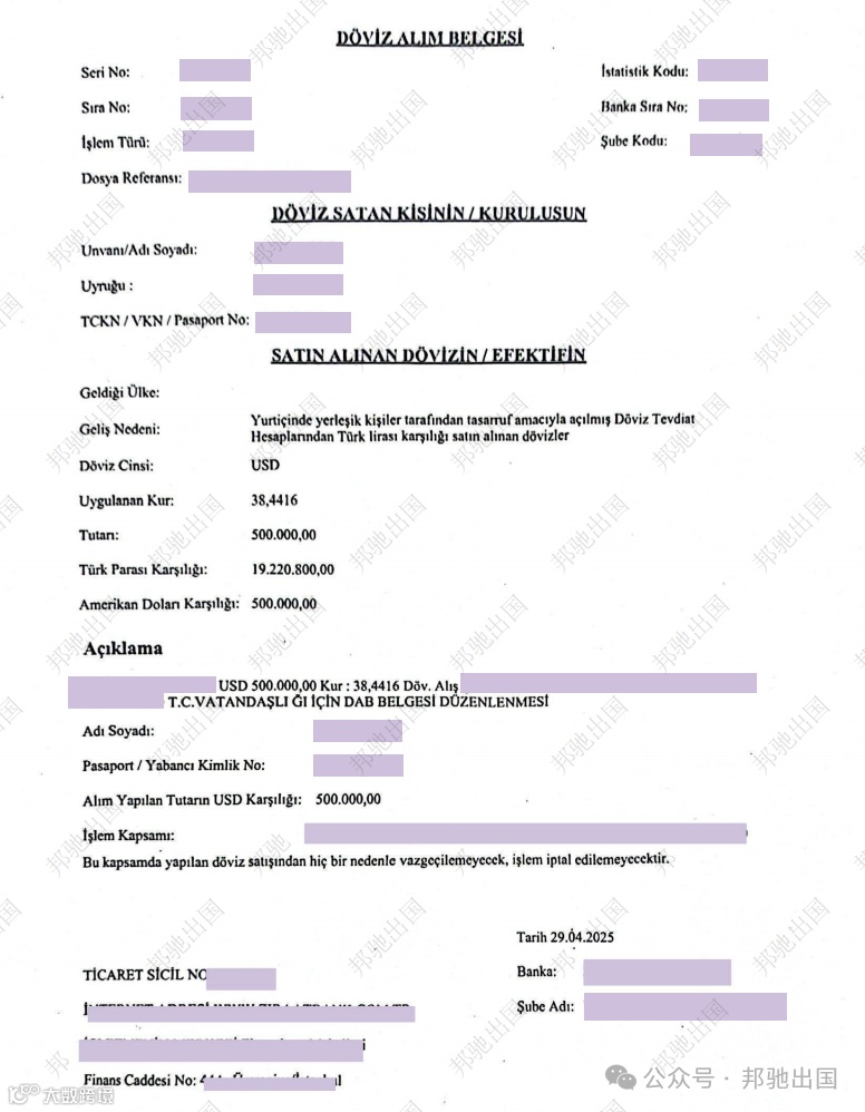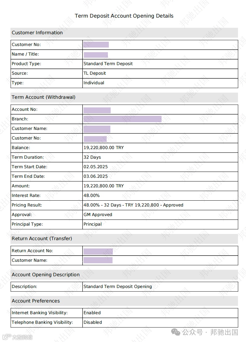 客户L先生是企业主,为了企业出海和让孩子在国内读国际学校,选择通过存款方式为一家五口办理土耳其护照。在定存期限选择上,客户选择了按照每月定存(存期32天),承诺存3年的方式办理土耳其护照。客户将50万美金转到名下的土耳其账户后,按照当天1美金=38.4416里拉的汇率,兑换成19,220,800里拉。
