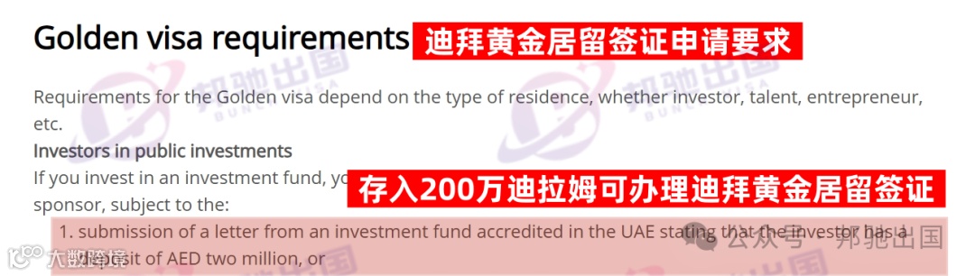 在迪拜符合申请要求的银行存入200万迪拉姆或等值55万美金(折合人民币约400万),且存款至少定存2年。