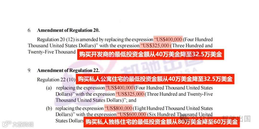 购买开发商房产的最低投资金额从40万美金降至32.5万美金;