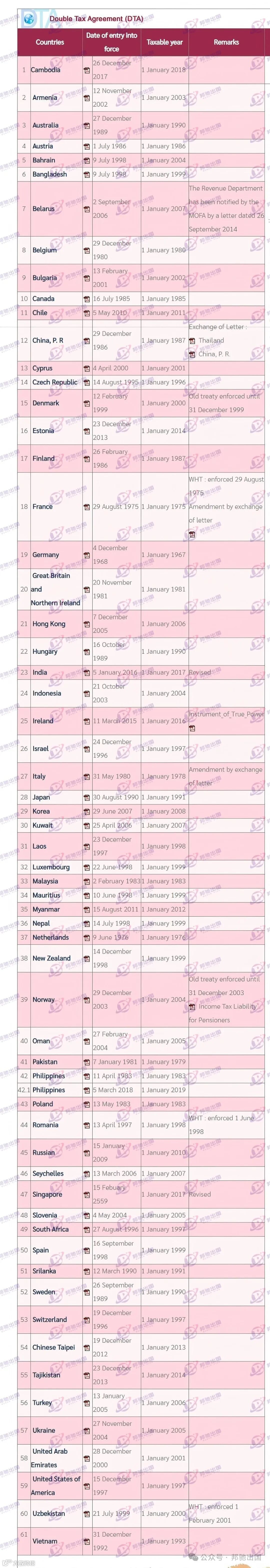 截至目前,泰国已经和61个国家和地区签订了避免双重征税协议,包括美国、澳洲、加拿大、中国、新加坡等,投资人可避免被重复征税。