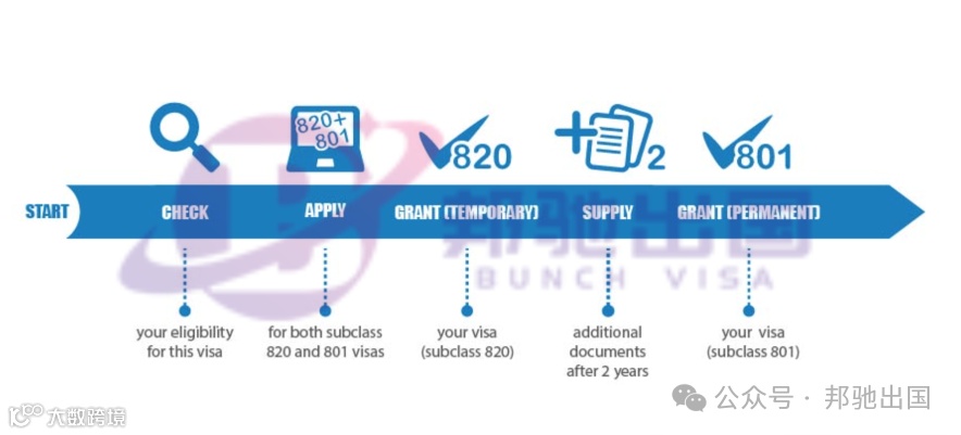 申请人在澳洲境内,可以申请澳洲820签证,持有澳洲820临时居民签证满2年后,两人的关系依旧存续,可申请转澳洲801永居签证。