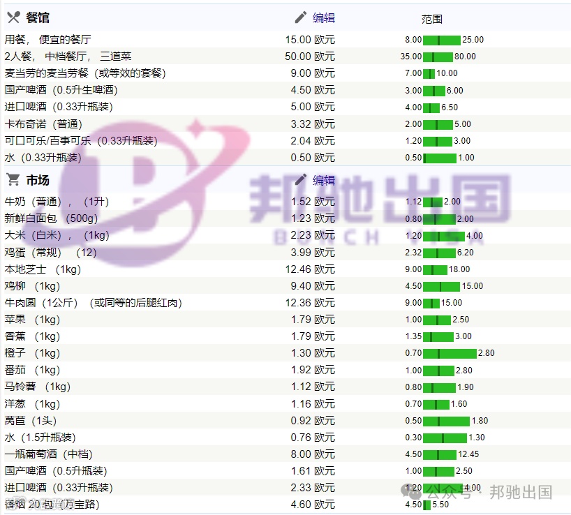 希腊的整体物价在欧盟成员国中属较低水平,农产品等自产产品价格合理,但工业品和其他进口商品价格较高。单人每月生活成本在1,200欧元左右,四口之家每月生活成本在3,000欧元左右。根据Numbeo全球生活成本质量数据网站显示,牛奶1.52欧元/升、鸡蛋3.99欧元/打、牛肉12.36欧元/公斤、苹果1.79欧元/千克。