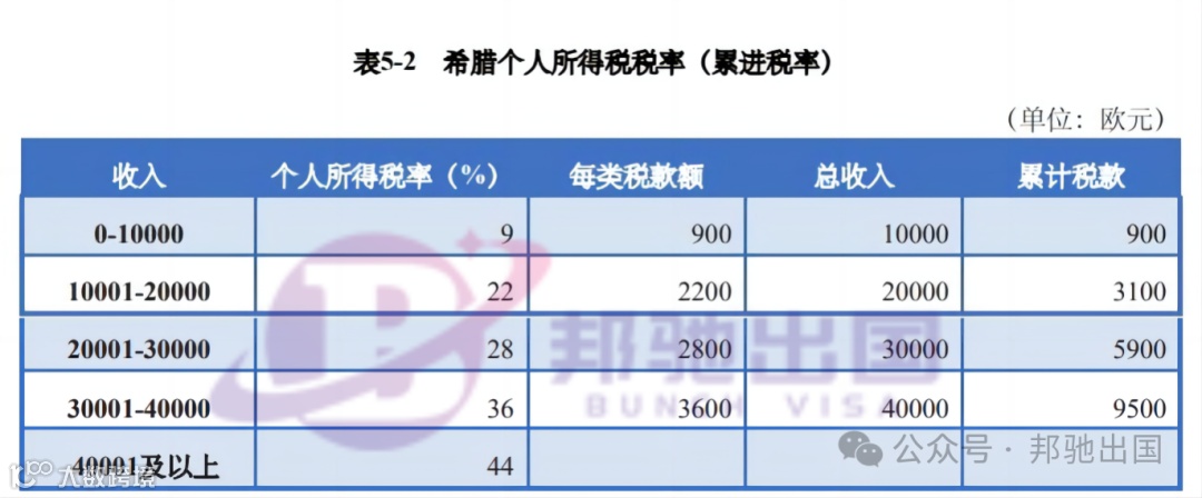 希腊实行属地征税,个人所得税实行累进税率,税率为9%—44%,从2020年1月1日起,希腊开始执行新的税务改革政策,年收入1万欧元以下的纳税人个人所得税税率从22%下调至9%。