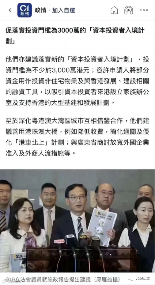 目前香港特区政府已经开始就第二份施政报告展开了公众咨询,新的施政报告将于10月25日发布,G19立法会议员就施政报告表达意见,除了在优化人口、改革税制和大湾区合作等方面提出建议外,还建议落实新的资本投资者入境计划: