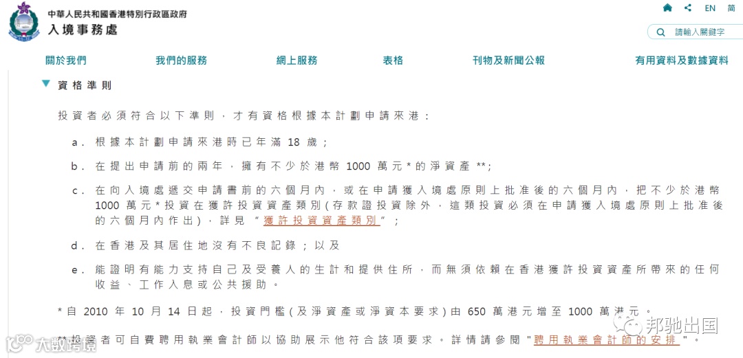在向入境处递交申请书前的六个月内,或在申请获入境处原则上批准后的六个月内,把不少于1000万港币投资在获许投资资产类别(存款证投资除外,这类投资必须在申请获入境处原则上批准后的六个月内作出);
