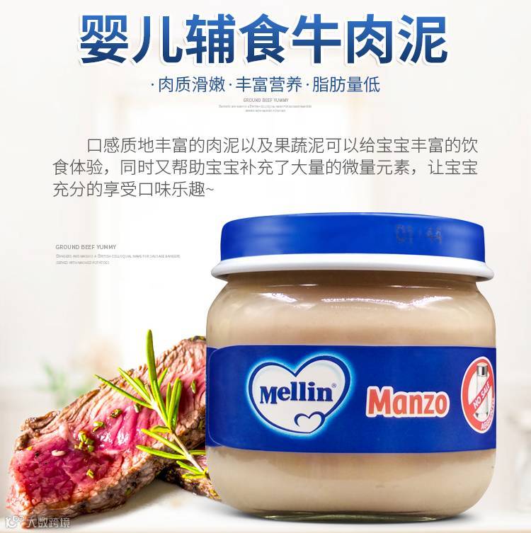 肉是婴幼儿很重要的铁和高质量动物蛋白质的来源。宝宝从断奶开始,要逐步引进各类品种的肉类。而肉泥是最适合婴儿特点的肉类食品。MELLIN肉泥所有原料经过精心挑选和检查,选用质量最好的真空包装肉类制成,以保持肉类所有营养成分,四个月起的宝宝就可以开始食用。产品不含任何防腐剂、色素和香料,严格按照法律规定,绝对没有妈妈们担心的激素问题。
