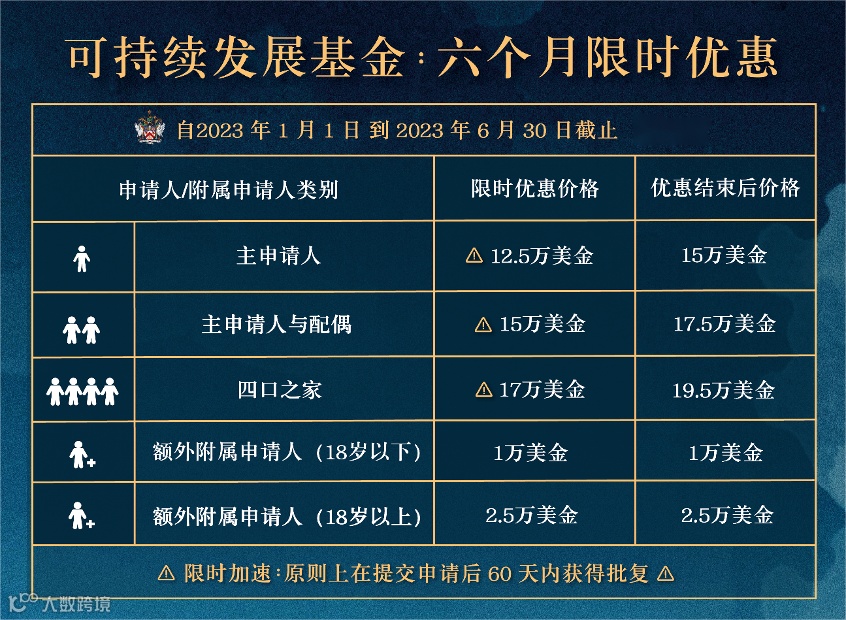 温馨提醒:2023年1月1日至6月30日期间,圣基茨可持续发展基金(捐款)项目推出限时优惠政策,6月30日前递交申请,立减2.5万美金,如果想赶在优惠期内申请圣基茨护照,就要抓紧时间办理了!