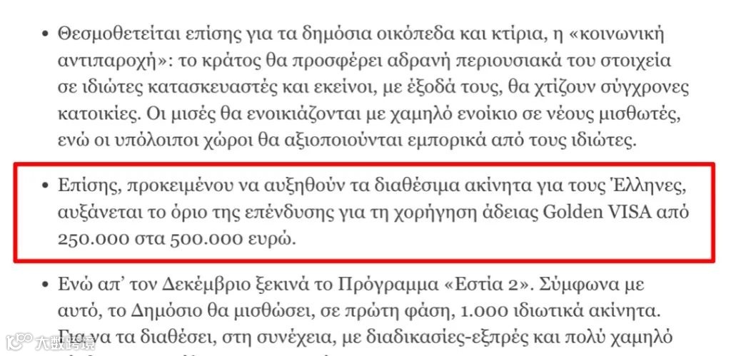 其中一条措施引发了全球投资者的关注:为了增加希腊居民的可用房地产,希腊黄金签证的购房投资门槛将从原来的25万欧元上涨至50万欧元!相关的修改细则和实施时间暂时未公布,不过根据以往的移民变政来看,从宣布到正式实施可能会有4-6个月的过渡期,这就意味着留给投资者们上车的时间已经不多了!