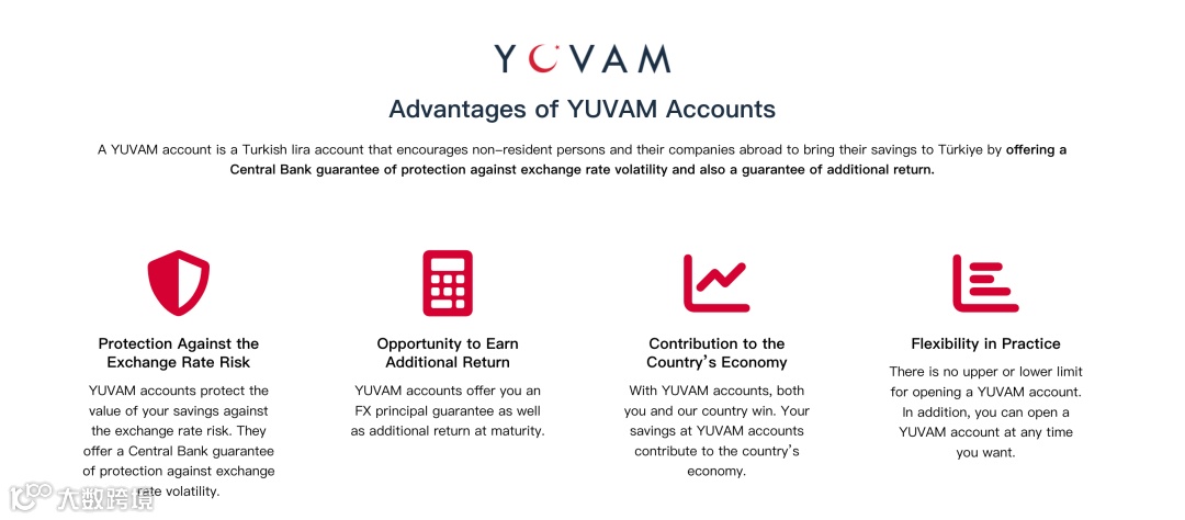YUVAM账户为土耳其里拉账户,土耳其中央银行保证此账户的存款免受汇率波动的影响并提供额外回报,鼓励非居民及海外公司在土耳其存款。