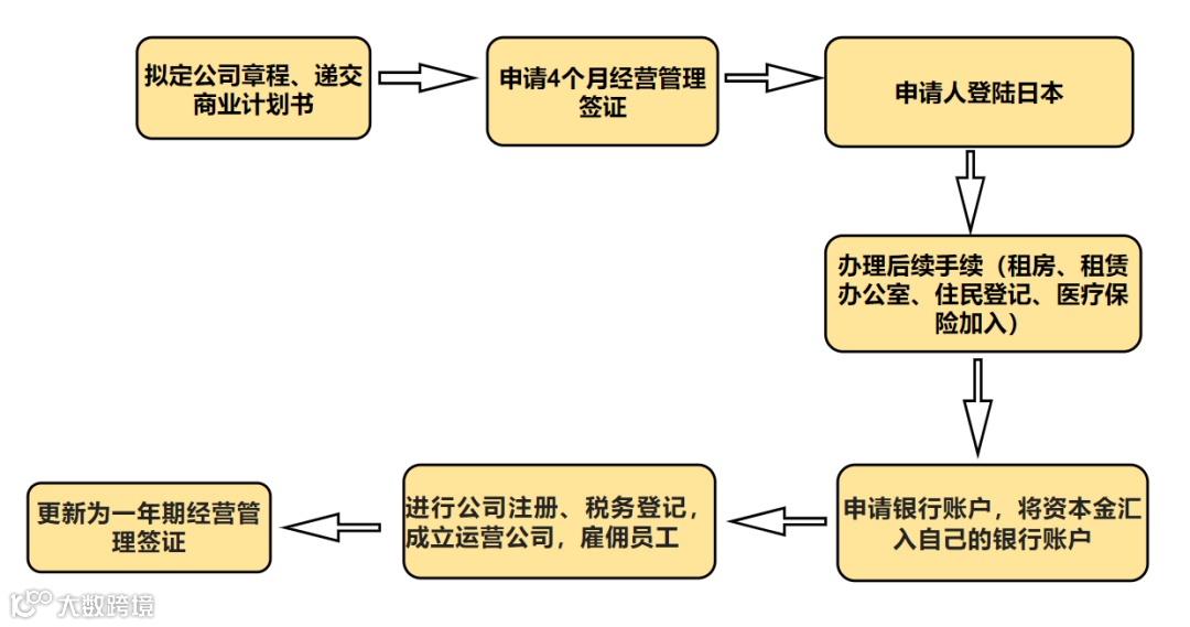 申请人获得4个月经营签证后可登陆日本,随后申请人可办理市役所住址登记、开设银行账户、设立公司手续等事宜,在完成公司注册经营后,可以更换一年期的签证。