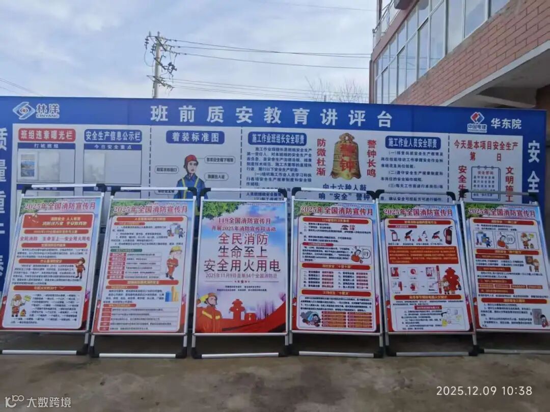 同时,项目部全面营造消防氛围,重点区域张贴标语、悬挂横幅、布置展板、视频循环播放宣教片;并且组织项目全员观看消防宣教内容、发放知识手册,从法规到应急避险,将消防知识传递给每一位成员。