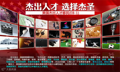8.我 们很高兴的通知各位,在2013年的美国移民项目中,杰圣独家操作的EB1类杰出人才移民获得了骄人业绩,那些演艺、文化、艺术、体育等方面具有才能的申 请人在4个月内获得了他们的移民批准,全家无条件无投资的进入了美国进行发展;同样,我们甄选的EB5项目也获得了申请人的认可和成功;