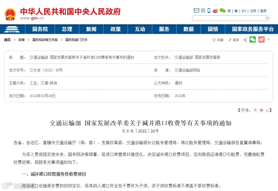 为深入贯彻落实党中央、国务院决策部署,促进口岸营商环境优化,近日,交通运输部、国家发展改革委联合印发了《关于减并港口收费等有关事项的通知》,决定减并港口收费项目,定向降低沿海港口引航费,完善拖轮费收费政策。本通知自2022年4月1日起执行。