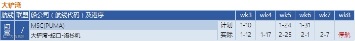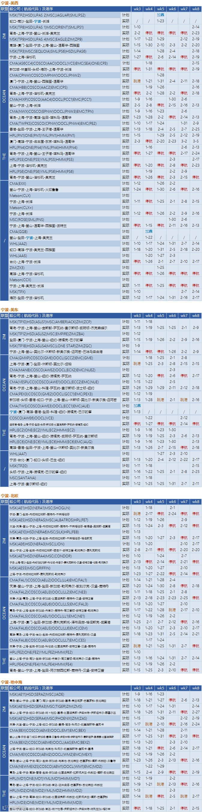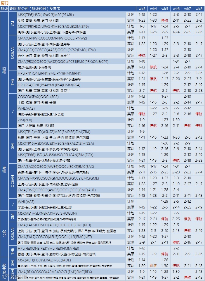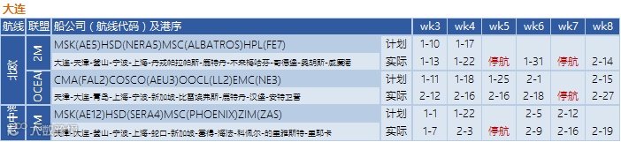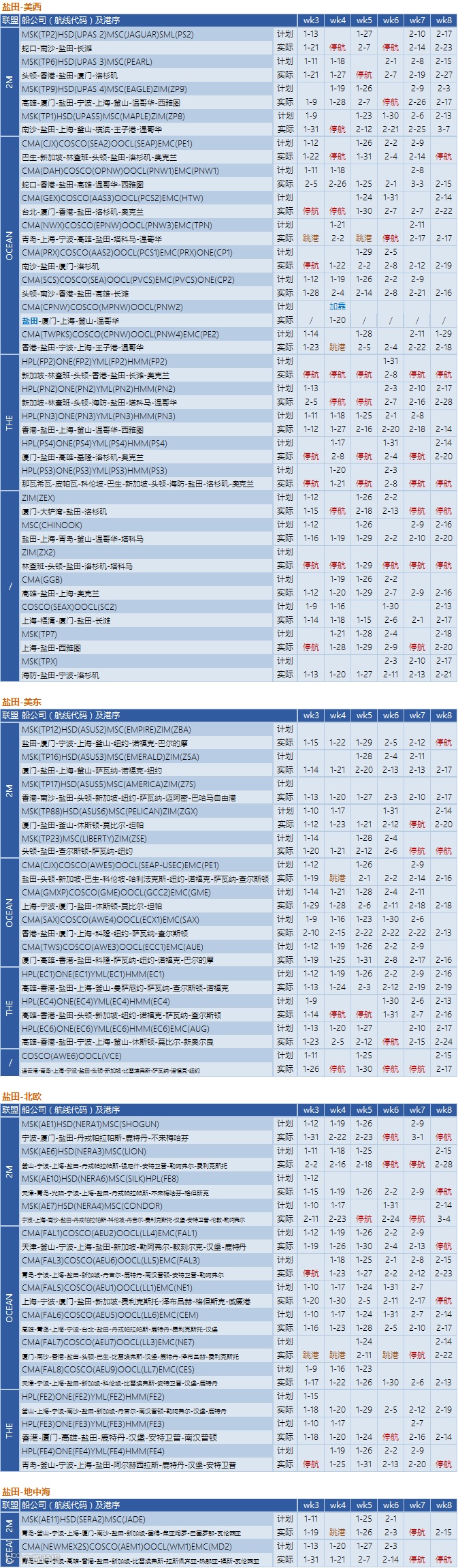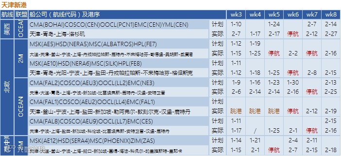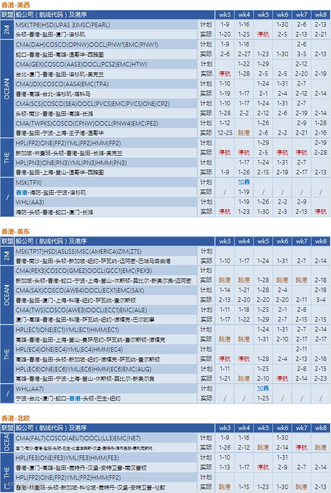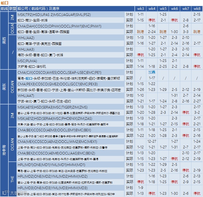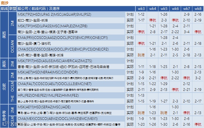 以下是容易船期统计中国大陆到北美、欧洲和地中海第03-08周(2022/1/9起-2022/2/19止)停航跳港汇总: