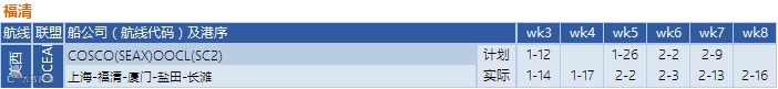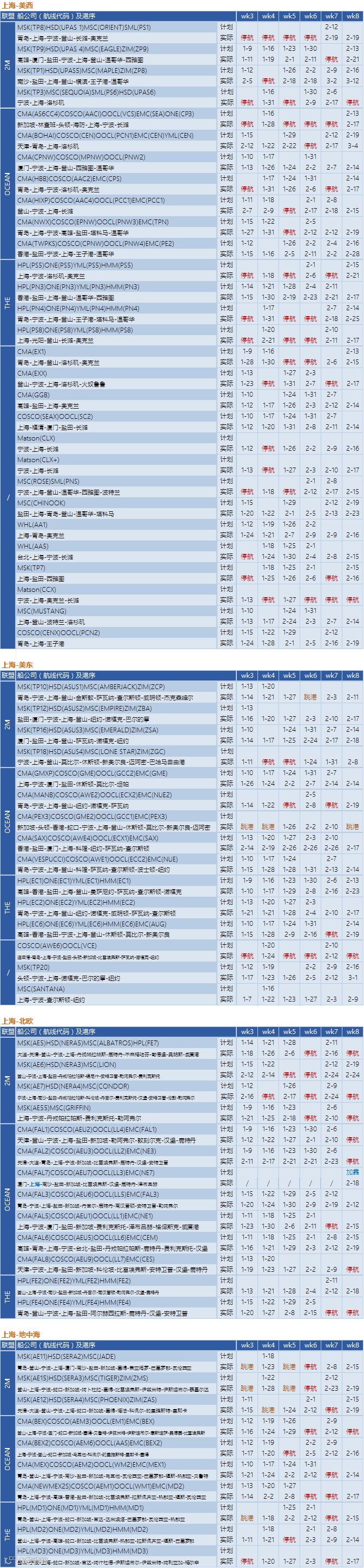 舱位和设备紧张局面从去年年末延续至今,市场需求长期超过供给。由于频繁停航和跳港,舱位十分紧张、设备依然严重短缺。各承运商出现超订,已开始限制受理订舱,或安排甩柜。由于持续不断的货轮延迟和改期,航次表可靠性很低,春节前出航延迟将严重影响节后航运。1月上半月运价小幅上升,由于春节前传统高峰季来临,预计1月下半月价格将继续上升。