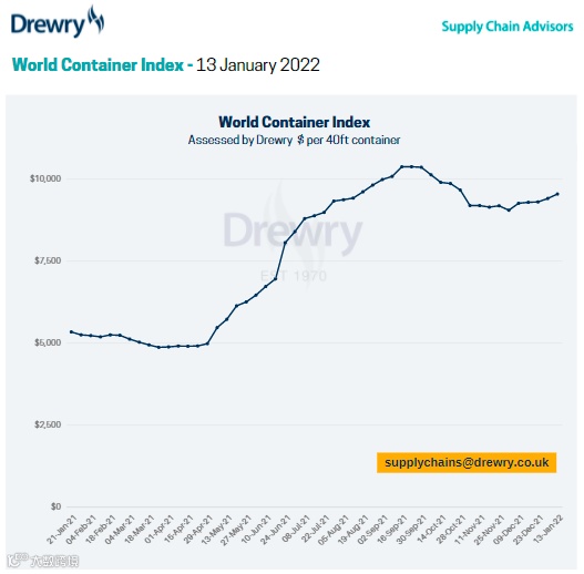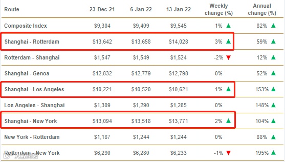 德鲁里指数显示,自2021年9月中旬以来跨太平洋航线的运价下降之后,现在运价连续第六周上涨。上海至鹿特丹的运费上涨3%即370美元,达到14028美元/FEU。同样,上海-洛杉矶和上海-纽约的运费分别上涨1%和2%,达到10621美元/FEU和13771美元/FEU。德鲁里预计,未来一周利率将继续攀升。