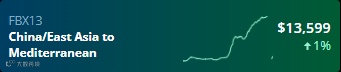 此外再关注一下本期最新波罗的海货柜运价指数(FBX),数据显示,亚洲至美西和亚洲至欧洲地中海航线的现货集装箱运费继上期出现下跌后本期再次上涨;而亚洲至美东航线继续小幅上涨。FBX数据显示: