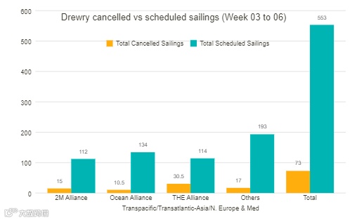 根据德鲁里日前发布最新数据,接下来的4周(第3-6周)里全球三大航运联盟陆续取消了多个航次,其中取消航次最多的是达到15个航次;最少的海洋联盟取消10.5个航次;合计56个航次。