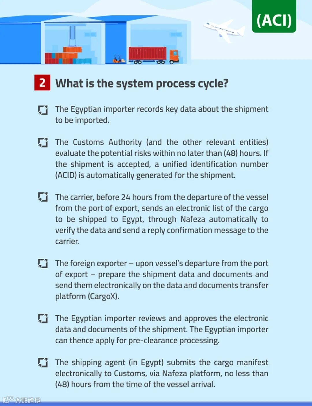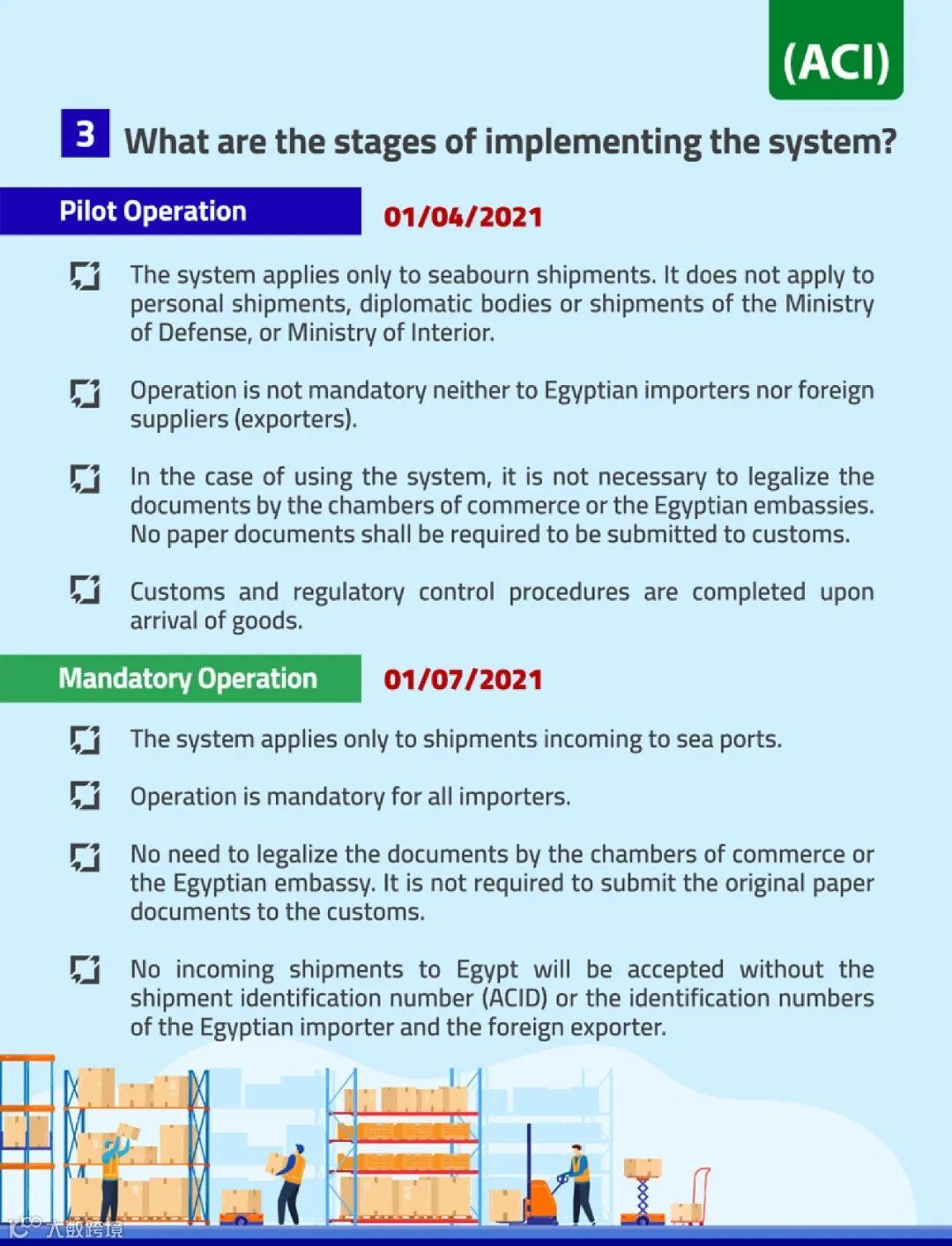根据埃及的新条例,进口商必须在起运港装货之前提前报告货物到达的情况,并等待有关部门的批准。一旦收到海关的批准(货物信息申报单),进口商有责任向出口商提供 ACID,以便他们能够更新与装运有关的所有文件,包括提单。