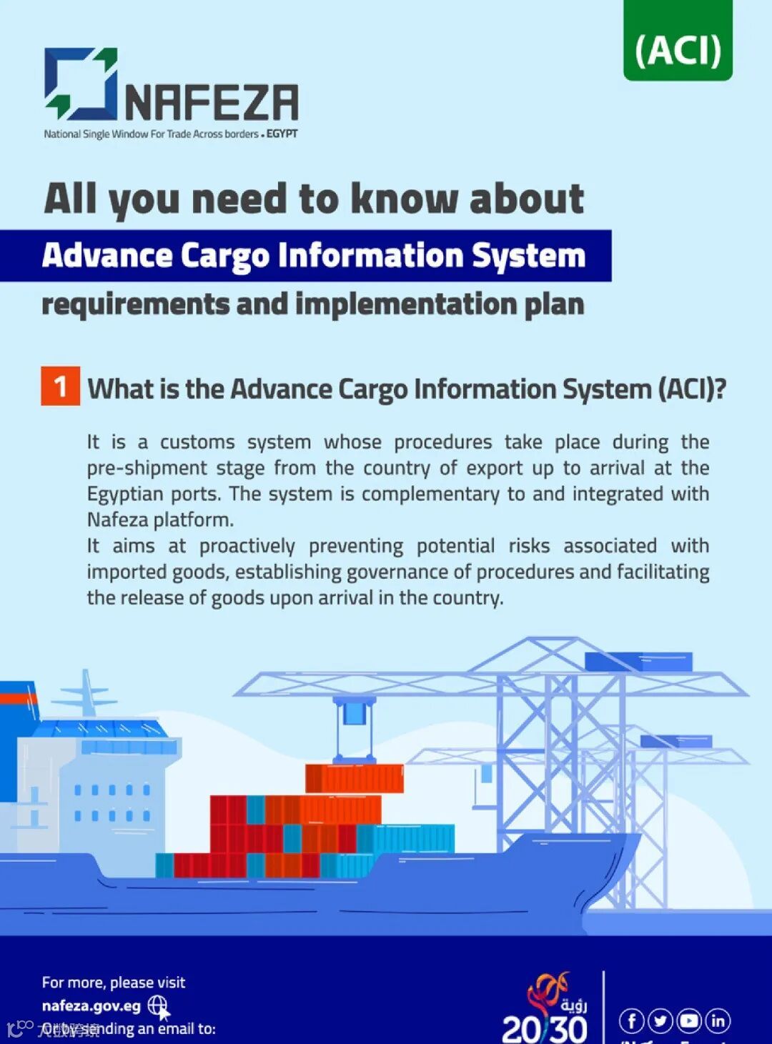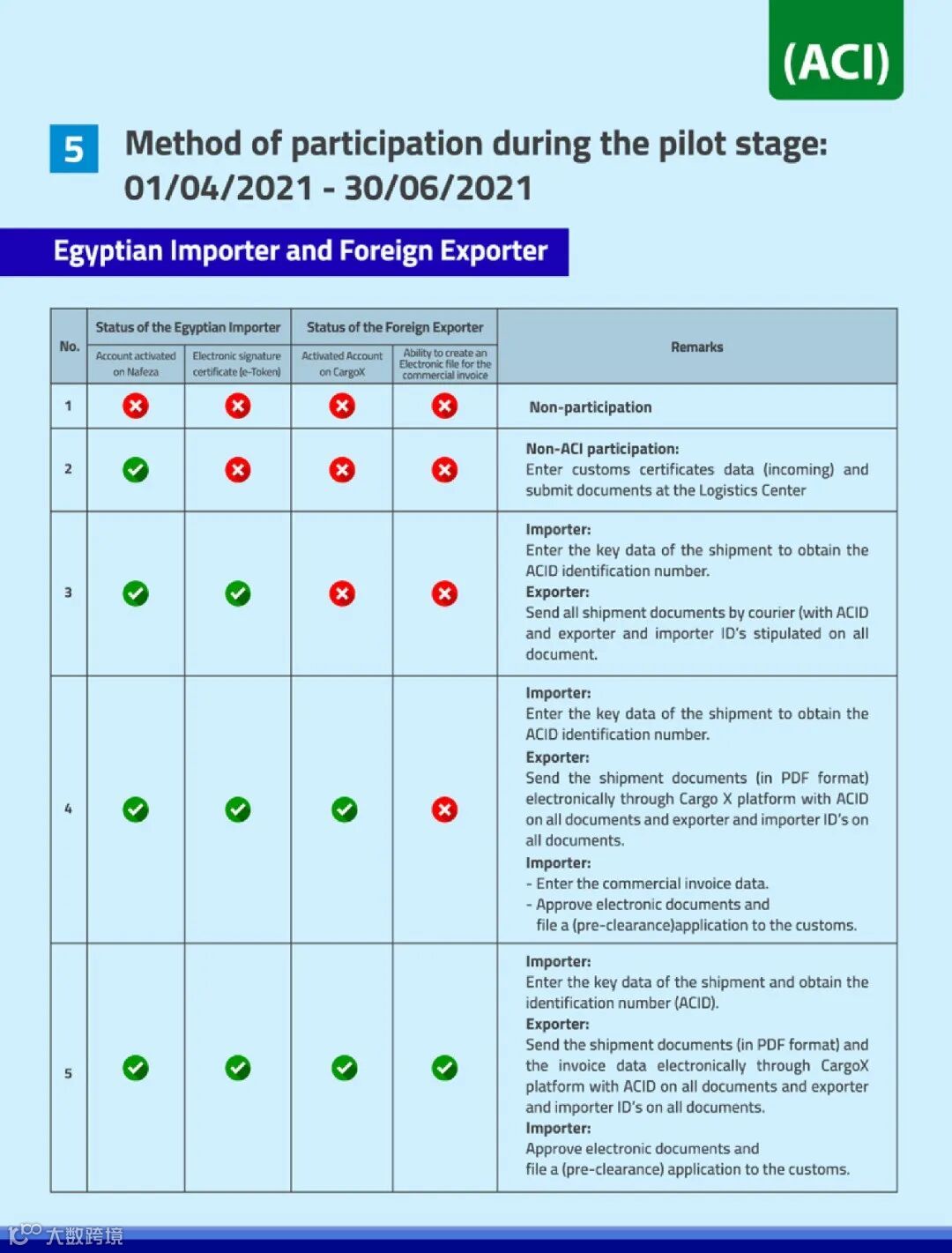 即在埃及港口实施 “Advanced Cargo Information (ACI) declaration”预报货物资料规定,所有进口的货物,收货人必须先行在当地系统预报货物资料以获取ACI Number,提供给发货人,此(ACI) Number要求强制显示在提单上和舱单上。2021年4月1日开始试运行,2021年7月1日起强制执行(均为到港日)。