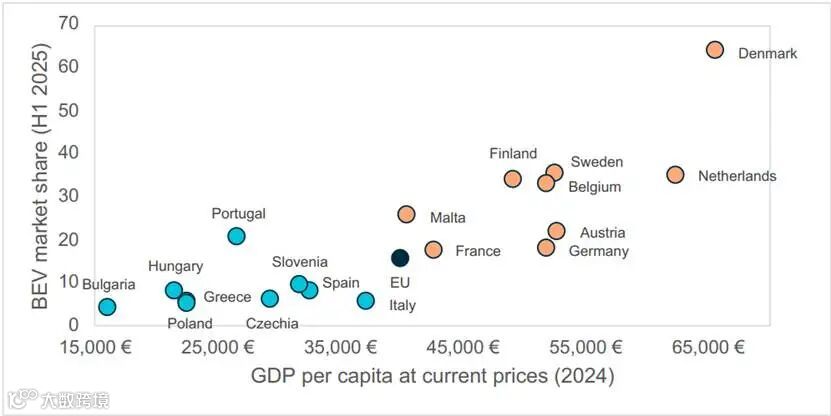 • 高收入国家(人均GDP超4万欧元):平均BEV市占率高达 29.7%,丹麦以 63.8%位居第一。