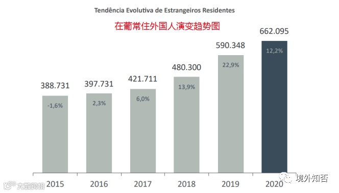 据葡萄牙2020年Immigration, Borders and Asylum Reports显示,近年来由于有利的经济环境及移民政策等的影响,尤其是就业的增长,推动了2015年至2020年期间在葡常住外国人口的增长,总计增加了273364人,连续五年递增且2020年外国人口比2019年增加了12.2%,2020年持有居留证的外国公民总数为 662095人,也是有史以来最高数据。由此数据可以看出,越来越多的人选择前往葡萄牙生活、居住、就业、留学和投资。