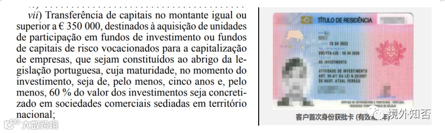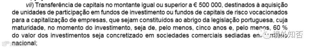 葡萄牙基金移民政策------葡萄牙2017年11月26日生效的第102/2017法案中,允许非欧盟国家公民可通过资本转移的投资方式获得葡萄牙“黄金签证”。依据此法案申请黄金签证的非欧盟国家公民,应投资至少35万欧元购买公司资本化的投资基金或风险投资基金。其投资期限至少是五年,并至少有60%的投资通过总部设在葡萄牙境内的商业公司实现。