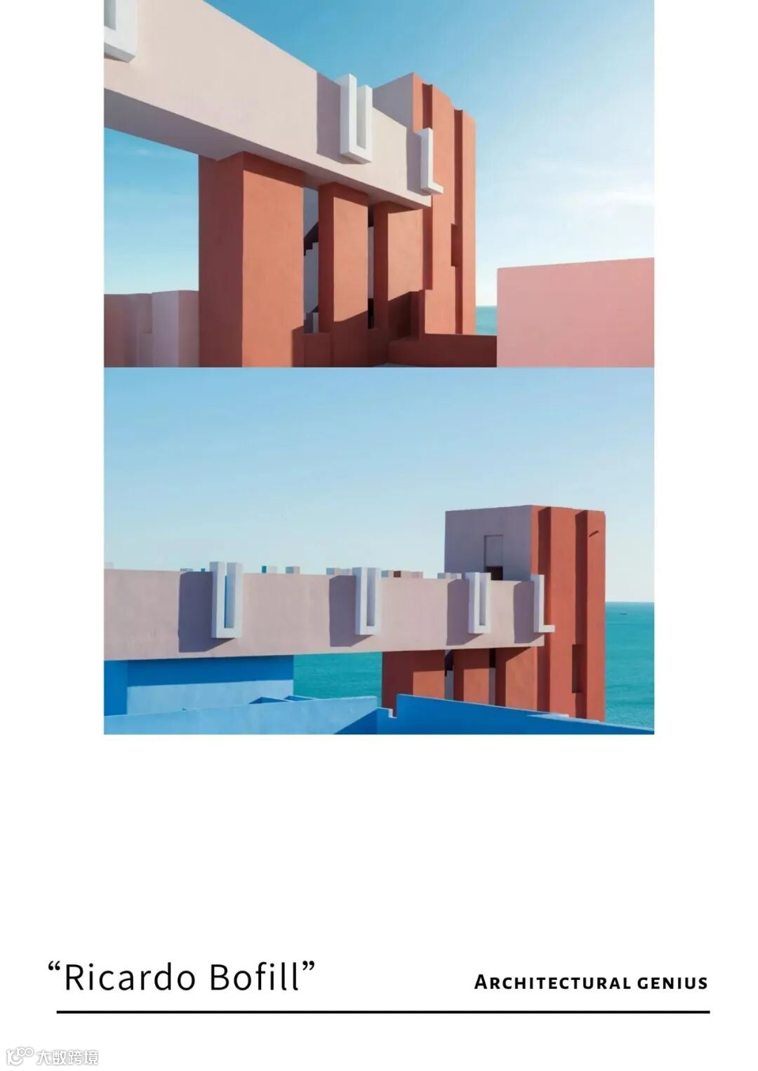 Ricardo Bofill(里卡多·波菲尔):西班牙「建筑鬼才」,在他的作品中经常出现奇特的几何图案和大胆艳丽的色彩,建筑动态的形式和欢乐色调的轻微注入唤起有趣的氛围。他的视觉风格总能将传统和神秘多变、严谨理性都无缝结合在一起。