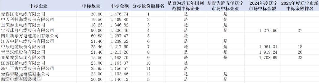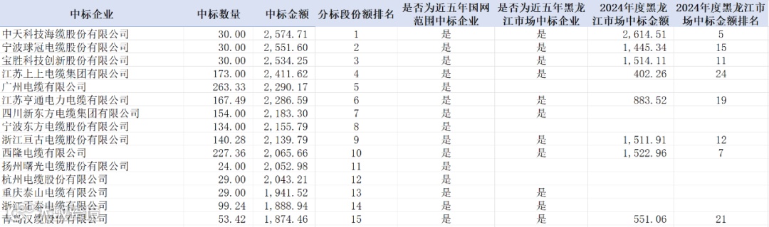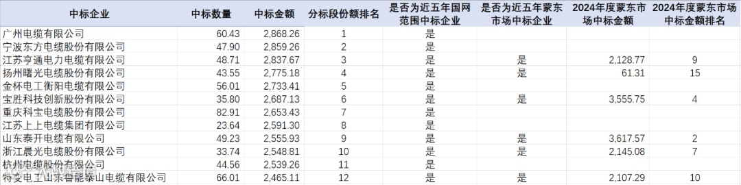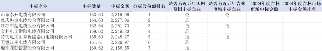 分析市场能力变化,2024年度中标企业中7家企业本次项目中标金额排名高于或与2024年度接近;0家近五年未在国网范围中过标的企业实现中标。详情如下: