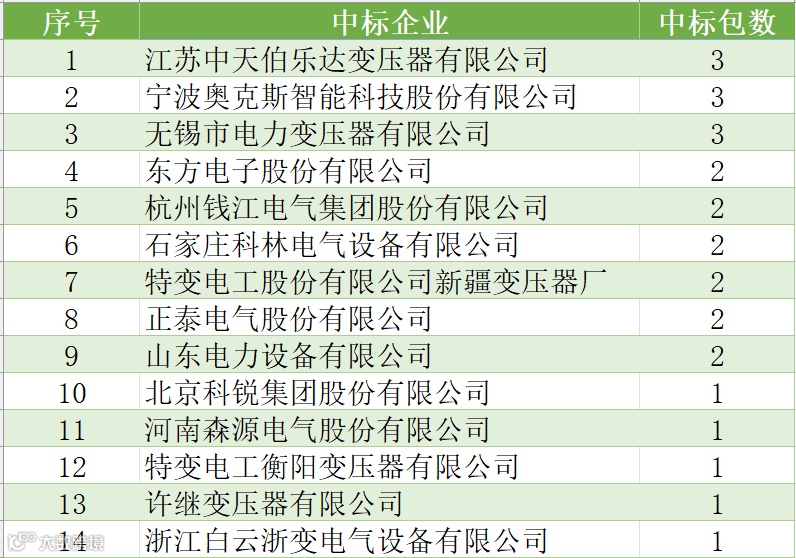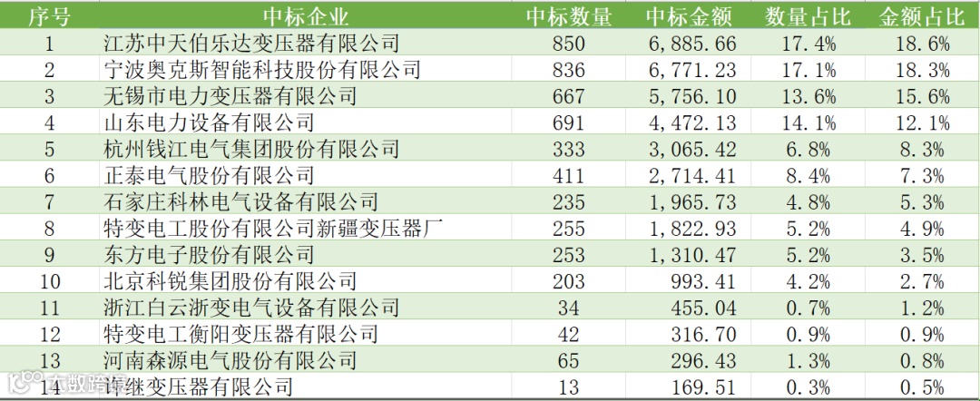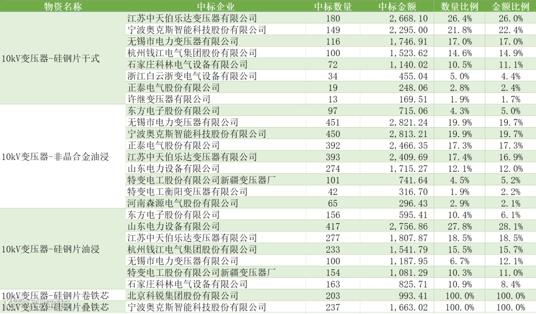 10kV变压器部分,本次项目中标的14家企业,在2024年度总中标金额排名最低的为108名,其中8家企业在2024年度总中标金额排名在前50名以内。有2家企业在2024年度没有中标10kV变压器。