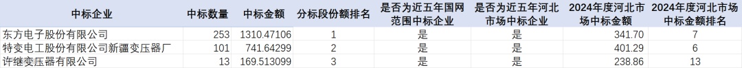 分析市场能力变化,2024年度中标企业中3家企业本次项目中标金额排名高于或与2024年度接近;0家近五年未在国网范围中过标的企业实现中标。详情如下: